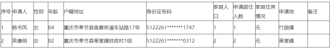 根据《重庆市公共租赁住房管理暂行办法》(渝府发〔2010〕61号)、《重庆市公共租赁住房管理实施细则》(渝国土房管发〔2011〕9号)等规定,以下申请对象(详见附表)符合公租住房保障规定条件。现将符合申请条件的对象情况公示如下,请广大群众予以监督。如有申请不实、弄虚作假或有异议的,请在自公示之日起15日内向县住房城乡建委反映、举报。
